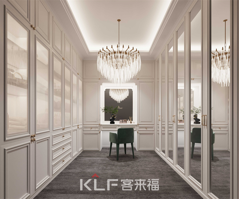 衣帽間配備雙開玻璃門,長虹玻璃搭配銀鏡的衣柜門板組合,將整個古典衣帽間功能分區(qū)更加合理,太陽花金色拉手的使用,既能體現古典產品的元素特征,同時也是現代感極強的一種體現。