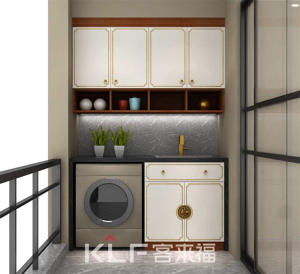 擺脫陽臺的單一晾曬功能,靠邊打造一個小型洗衣區(qū)域,分散家庭成員的梳洗壓力。上下安裝柜體,分散存儲壓力。