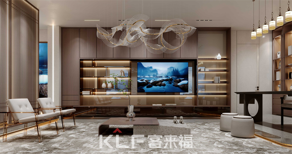 中式元素結合現(xiàn)代帶燈金屬柜和層板燈設計,讓人眼前一亮!藏露相宜的柜體設計,讓空間更具層次感;無拉手門板設計,符合現(xiàn)代人對生活的簡單追求;整體的中式裝修,展現(xiàn)出內(nèi)斂、質(zhì)樸的主人性格。客來福的新中式風格,兼具了實用與現(xiàn)代感。