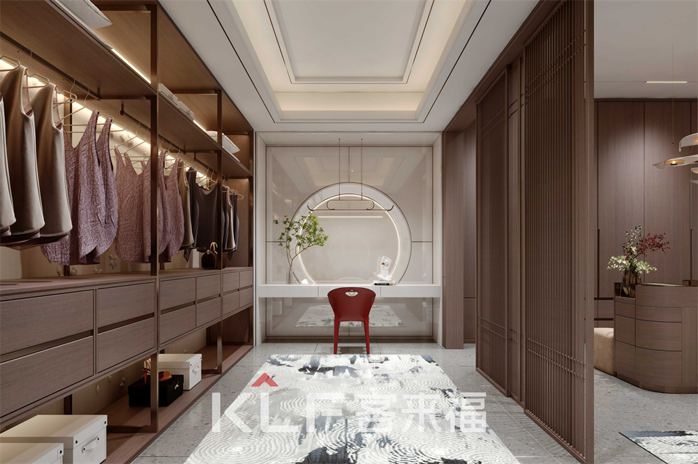 新中式開放式衣帽間,以屏風分隔其他空間,打造出一塊相對的獨立區(qū)域。背板運用皮雕工藝,鋁木型材框架搭配實木材質(zhì),布局主要存儲區(qū)。底部掏空,增強衣帽間的靈活性,中下部安裝推彈軌道抽屜,觸摸即可抽拉。