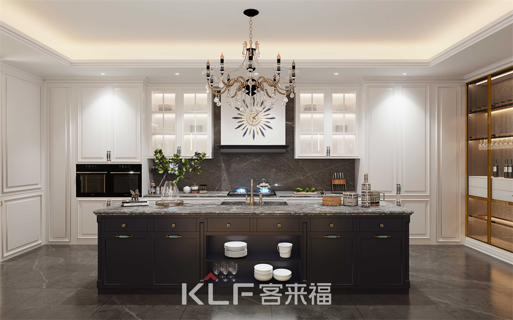 古典混搭設計風格產品帕克系列,采用混油造型門板和芬蘭白升級柜體,造型線條和混油處理門板搭配現代質感的巖板和金屬玻璃門,從簡單到繁雜、從整體到局部,精雕細琢,給人一絲不茍的印象。