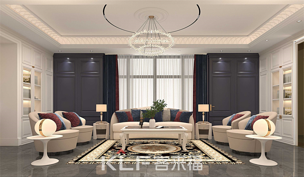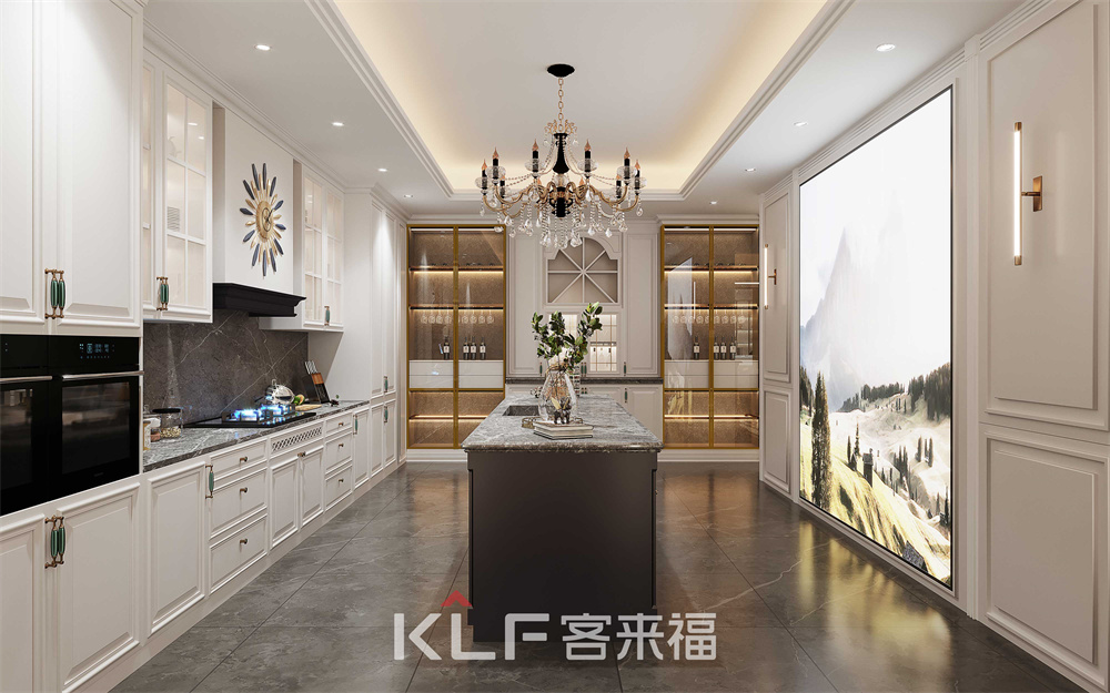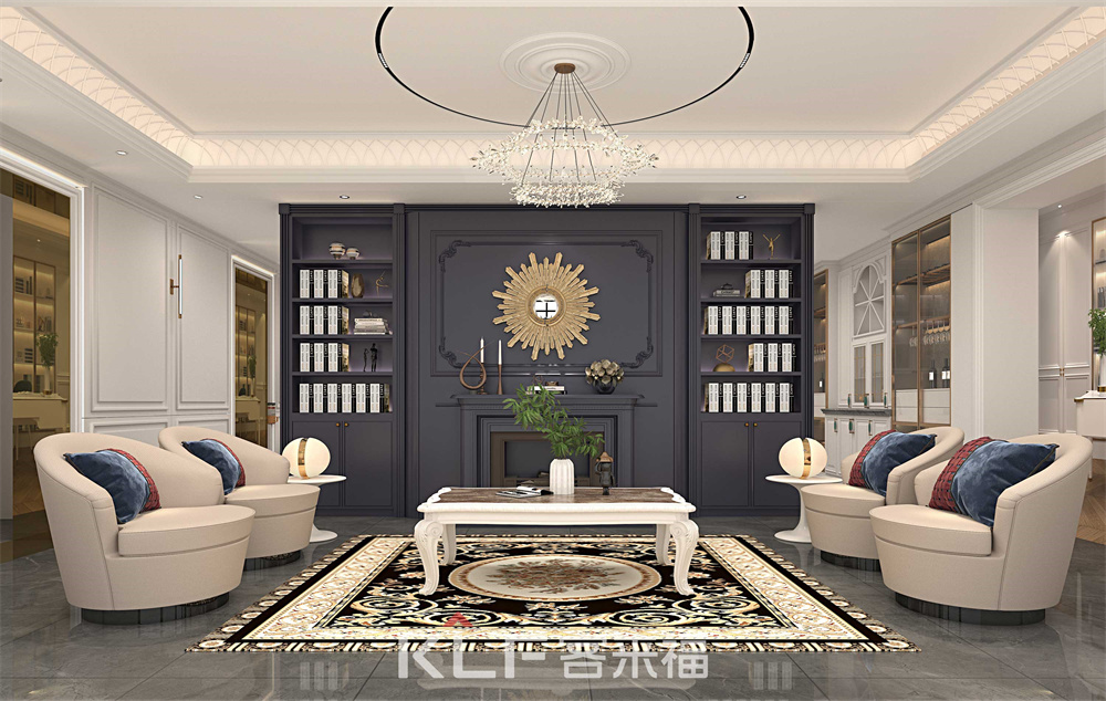 超長的中島臺,采用古典邊型的石英石臺面,灰藍色整體配色沉穩(wěn)大氣,餐邊柜采用巖板背板,是古典混搭系列的點睛之筆,客廳空間同樣采用雙色配套,壁爐柜的使用更是時下豪宅的標配。