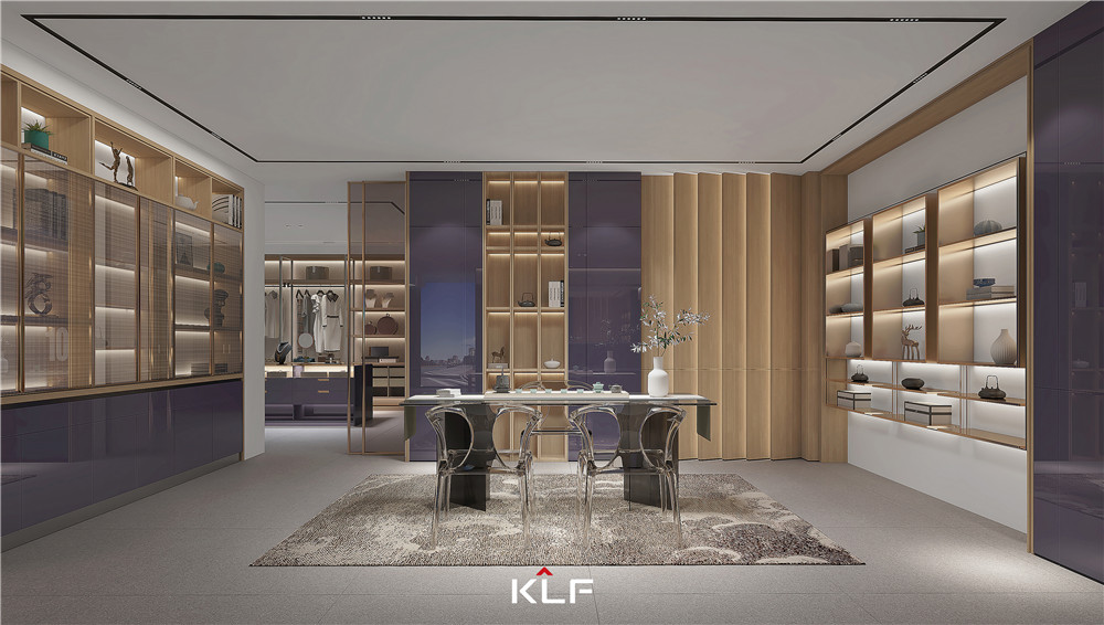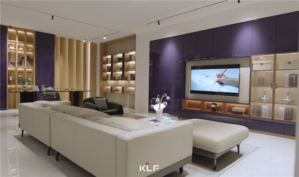 客廳采用圍合式布局,一側(cè)墻壁做鏡面處理,與柜體進行模塊化組合;矩陣成型的柜體紫棠色映入眼簾,活潑且高級;烤漆門板順滑且頗賦光澤感,展現(xiàn)出客來福的創(chuàng)意工藝。
