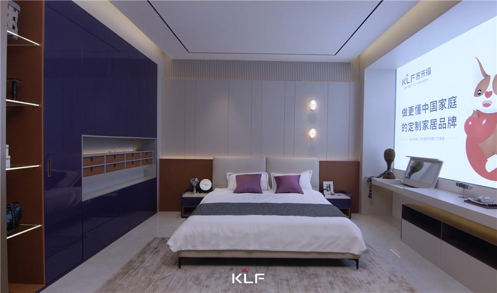 主臥從材質(zhì)上進行升級,床頭護墻板采用茶白色+淺可可色+愛馬仕橙的組合配色,設(shè)計感在線;在紫棠色衣柜上,客來福加入了皮革元素,襯托出空間的品質(zhì)感。