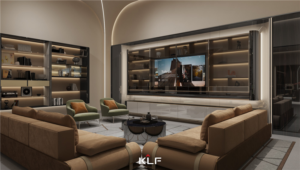 客廳以弧讓天花板與墻板自然銜接,簡潔而氣場十足;黑檀木線條與黑檀羅馬柱的運用,賦予空間一份深邃美感;施華洛世奇水晶蝴蝶拉手,使得空間更加精致唯美。