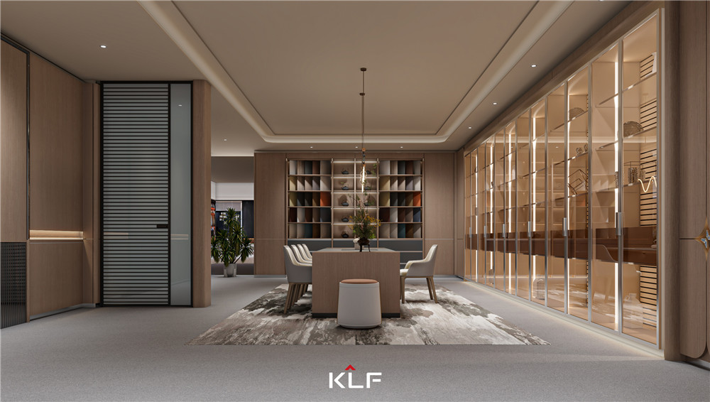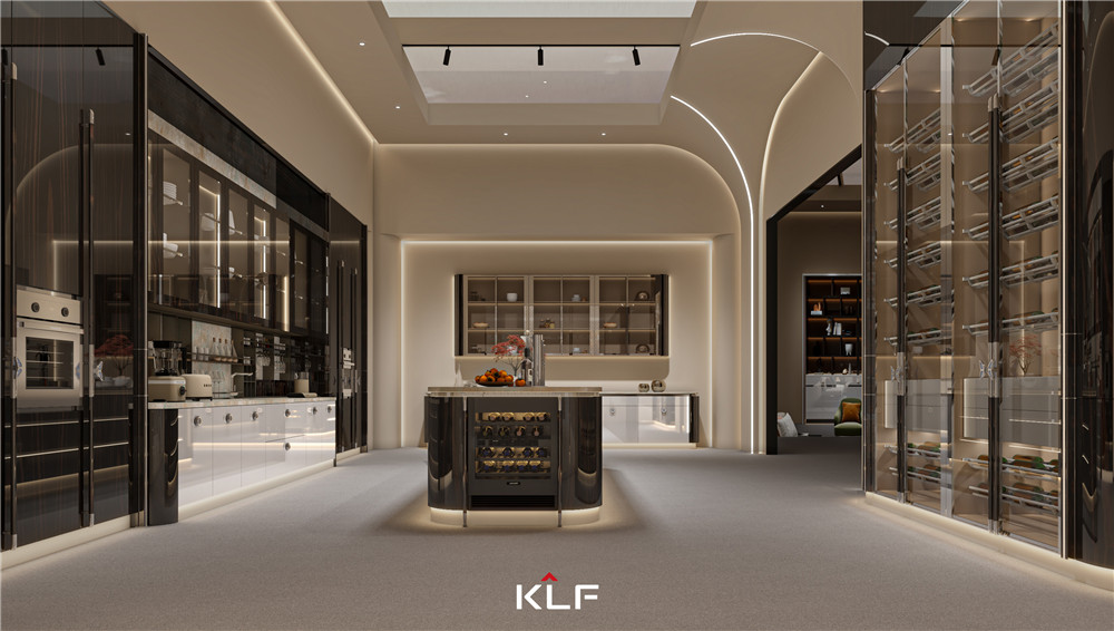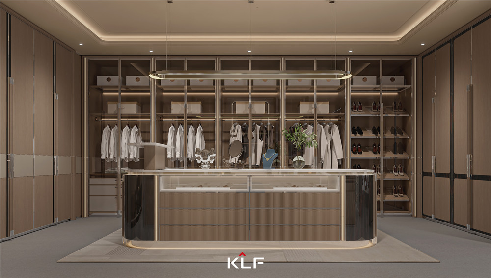 顏色上以白橡小山木紋搭配玻璃來呈現(xiàn)出輕奢,氛圍燈光渲染出柔暈光線,增加層次感;獨特的“F”品牌標簽拉手,寓意“福”;掛衣桿以KLF中的“K”為靈感,打造了一個具有品牌辨識度的蝴蝶掛衣桿。