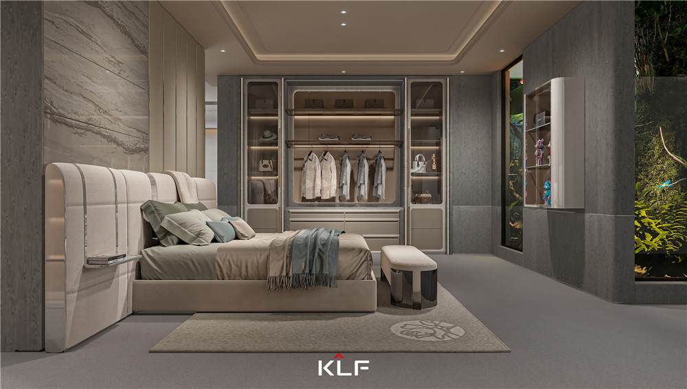 臥室背景墻以高級灰為主,金屬線條裝飾,營造出悠閑的空間氛圍;衣柜背板采用了客來福LOGO 標志實木雕刻板,頗具特色;兩邊配透明玻璃門對開門,方便換衣、打扮。