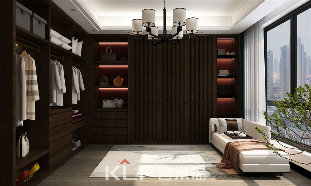 L型靠墻衣柜,藏露參半。中部黃金區(qū)域掛常用衣物,擺放常用物品。頂部鏤空,成就換季衣物,不常用衣物的存儲(chǔ)地。底部根據(jù)家庭成員需求,設(shè)計(jì)成抽屜與置鞋區(qū),結(jié)構(gòu)明晰??看暗纳嘲l(fā),讓衣帽間根據(jù)自己意愿,添補(bǔ)功能,如品茶、看書、觀賞等。